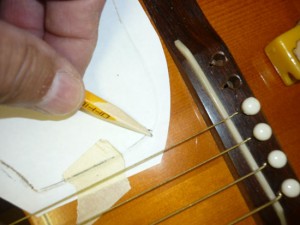 Once you get the outline all the way around the pickguard, take a crayon, or a pencil with ¼” of lead exposed, to make the outline permanent. While holding the crayon or pencil at an angle, rub it around the edges of the pickguard making a permanent line as your cutting guide. Be careful not to let the tip of the pencil scratch the guitar’s finish.
